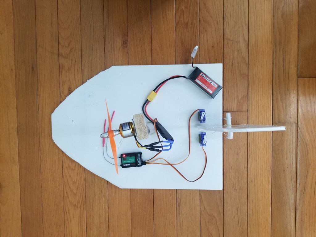 Per the advice of a Youtube video, I decided that before committing to a plane with quasi-fractal complexity, I would attempt to build a ‘hovercraft’. This method, which I strongly suggest for the beginner, allows one to make all the dumb mistakes on something that has zero probability of falling on someone’s head. It acts as a proof of concept, allowing you to find the proper rudder shape and propeller placement.