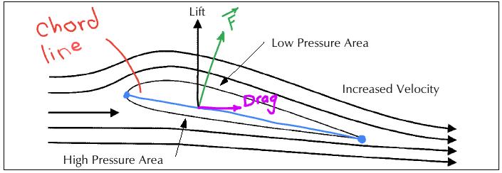 The above diagram shows the side of a wing, a shape known as an airfoil. In the diagram, we see the flow of the air stream around it, which imparts a net force F (in green) on the airfoil. F is called the aerodynamic force and can be separated into two components: lift and drag.