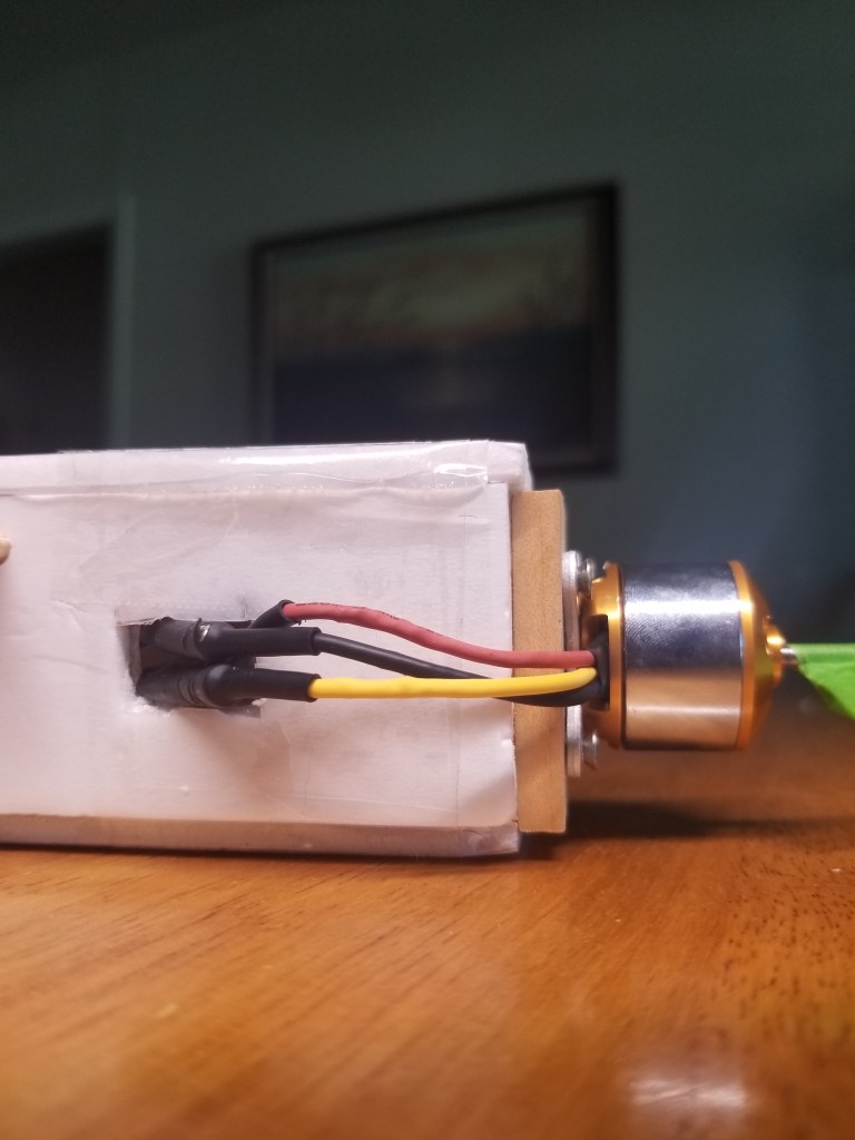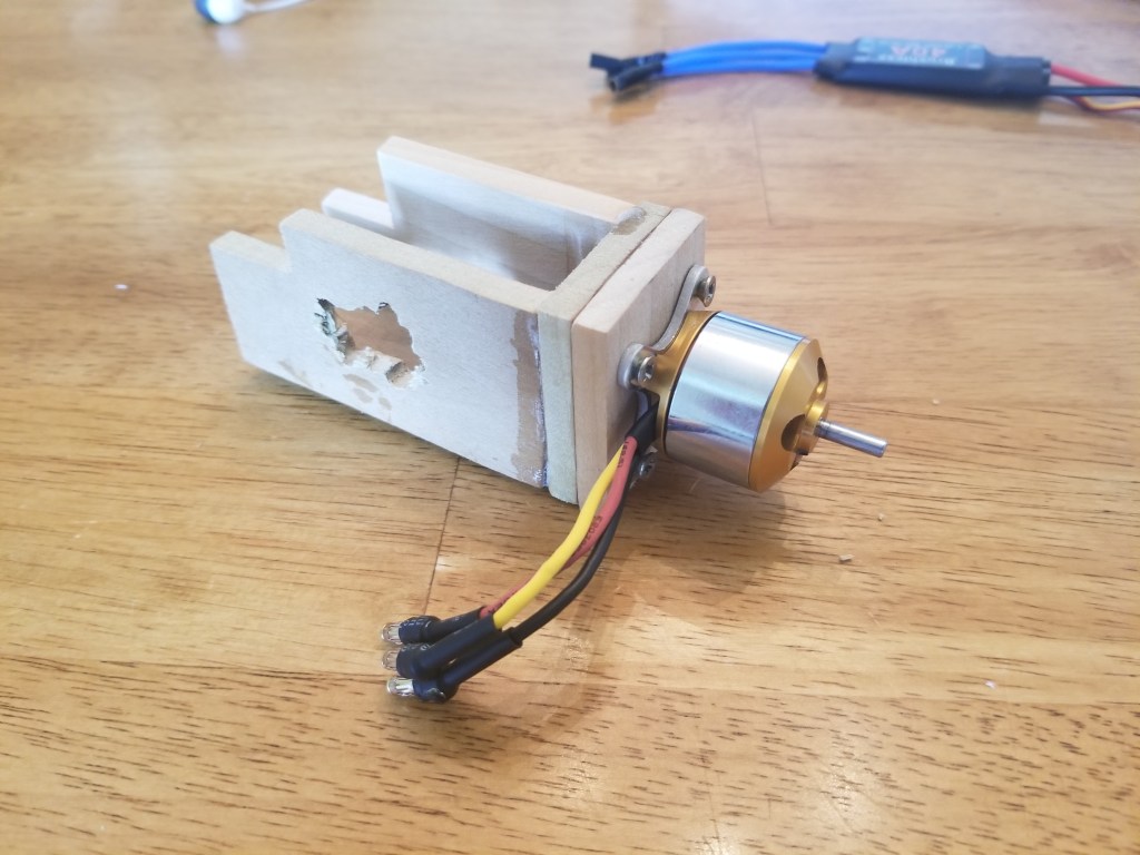 The motor was next and begot the worst mistake in this construction process. To make sure it wouldn’t fall out of the plane, I created a wooden mount for it. It was sized so that it could slide in snugly. The mistake? It was so heavy!