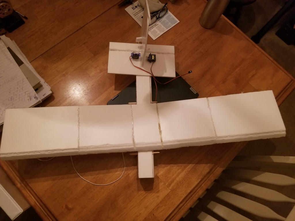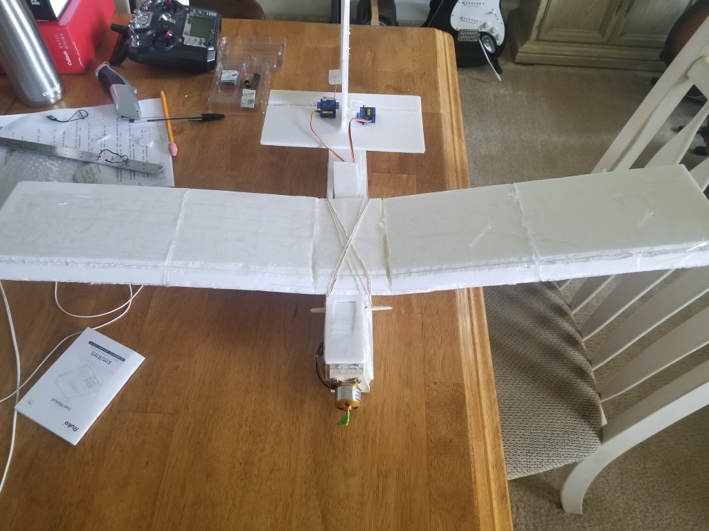 With the proof of concept finished, the 3-channel RC plane could then be tackled. I meticulously studied successful designs, learned of all the possible wing configurations, and practiced flying on a simulator. Construction commenced.