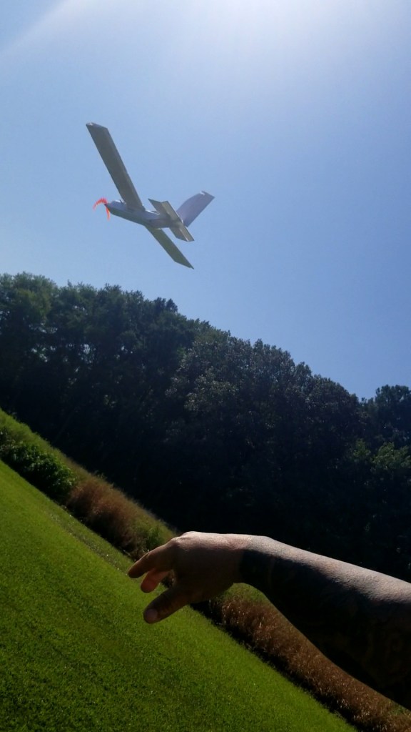 The grass was wet with dew and incredibly green. My father (who crashed the proof of concept, incidentally) was tasked with throwing the plane in one hand and recording the flight in the other. Two conflicting priorities, we realized, but it was necessary. He walked out onto the field with Augustus, holding the camera awkwardly.