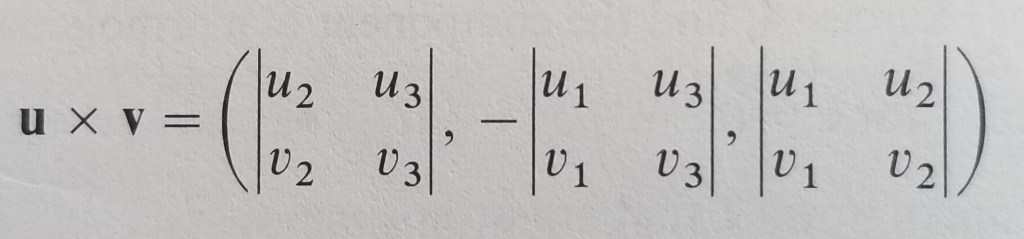 whose first row is constituted of the components of u (the first factor) and whose second row is constituted of the components of v (the second factor). The determinant in the first component of is obtained by taking the determinant of the submatrix that results when we delete the first column. The determinant in the second component is obtained by deleting the second column and prepending a negative sign. The determinant in the third component is obtained by deleting the third column.