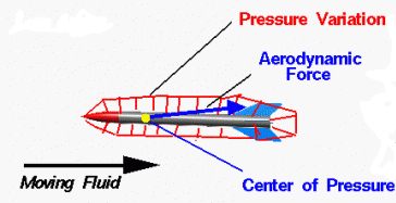 As can be seen from this diagram, the net force (called the aerodynamic force) on a rocket can be thought of as acting on the CP alone. Interestingly, the CP’s position depends on the angle of attack, i.e., on the angle it makes with airstream. The approximate rule-of-thumb describing this relationship is that, as the angle of attack increases, the CP moves toward the nose.